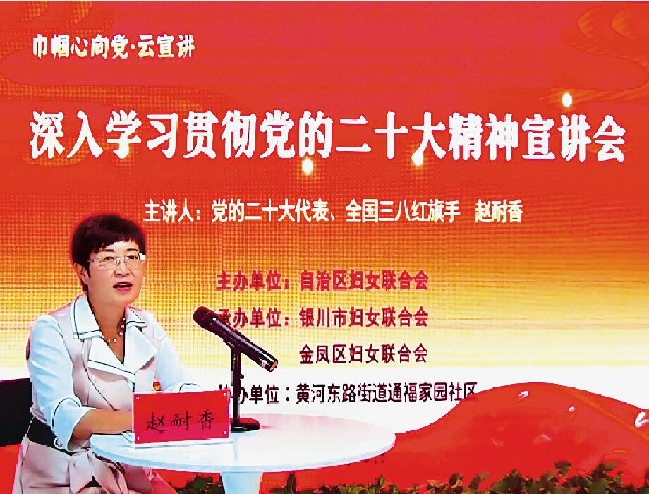 隔空对接“云宣讲”。各级妇联上下联动、同频共振,线上举办3场“巾帼心向党·云宣讲”直播活动,邀请党的二十大代表赵耐香、陈美荣、杨彦锋等结合参加党的二十大的所见所闻、切身感受和工作实践进行宣讲,全区各级妇联干部、执委和妇女群众5.66万余人通过收听收看直播聆听宣讲。自治区妇联在宁夏广播电台开设“女性之声”专栏,连线党的二十大代表解读党的二十大精神。银川市妇联联合银川都市经济广播电台开设专栏,邀请党的二十大代表走进直播间,面向广大妇女群众开展“云端”宣讲。