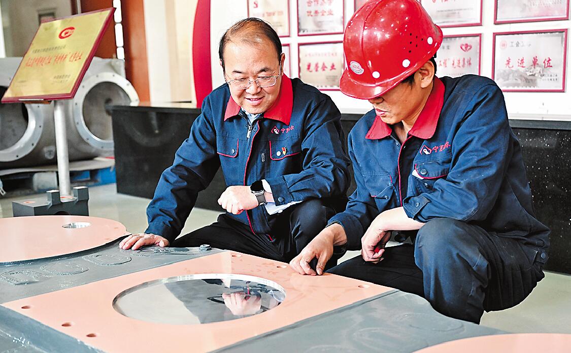 宁夏维尔铸造有限责任公司董事长王小宁(左)查看公司研发的中国标准高速动车组大型铝合金零部件。闫院平/摄
