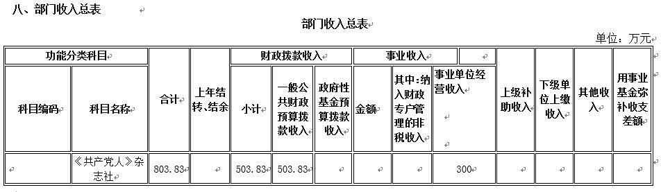 《共产党人》杂志社2017年财政拨款收支总预算503.83万元。收入预算包括:一般公共预算拨款503.83万元,政府性基金预算拨款0万元。支出预算包括:按政府收支分类功能科目逐项说明。如,一般公共服务支出 391.75万元、社会保障和就业支出71.65万元、住房保障支出40.43 万元。