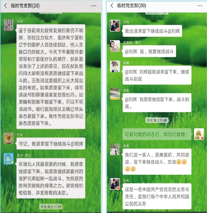 截至2月14日,宁夏回族自治区人民医院第一批援鄂医疗队的21名队员,已经在湖北襄阳前线奋战了20个日日夜夜。2月14日晚11时,临时党支部书记刘辉在微信群发了条消息:“鉴于目前湖北疫情发展形势仍不明朗……有没有愿意继续留下来战斗的?”不到半小时,就被刷屏了。“我愿意!”“关键时刻,共产党员不下火线!”“疫情不散,我们不撤!”21名队员没有一个人撤退,大家纷纷再次请战,继续留在襄阳抗击疫情,到3月8日,已经奋战近50个日夜。自1月28日第一批援助湖北医疗队出发以来,宁夏回族自治区人民医院已先后派出援助湖北医疗队共4批108人。