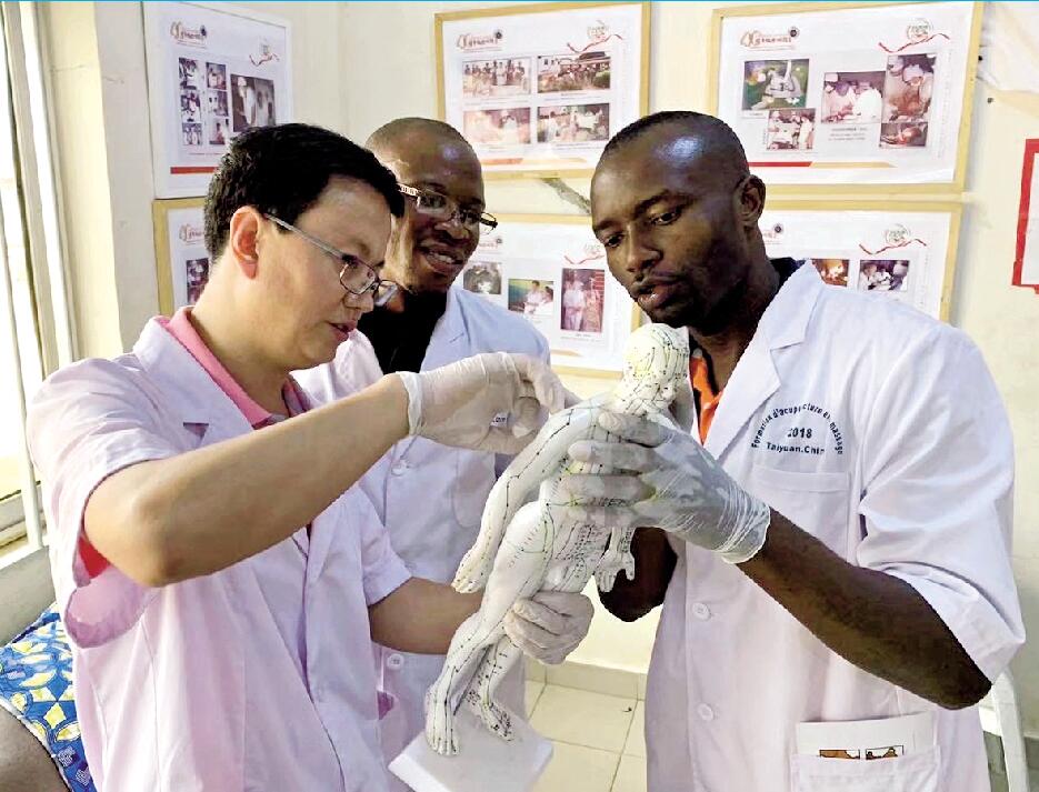 朱斌(左一)给贝宁当地医生讲解人体穴位