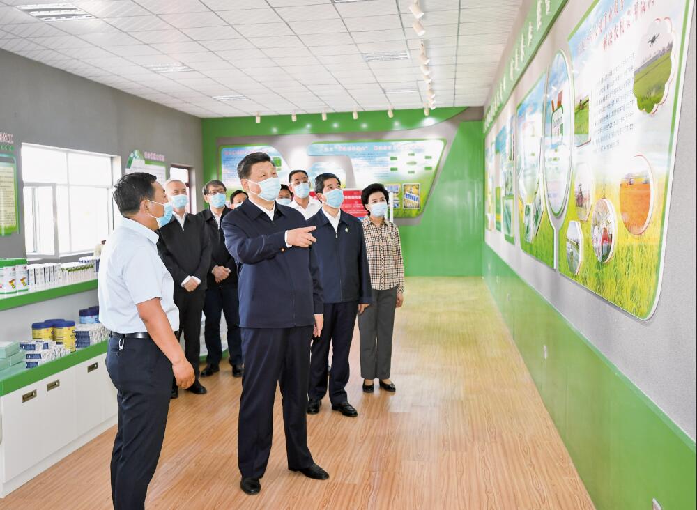 2020年6月8日至10日,中共中央总书记、国家主席、中央军委主席习近平在宁夏视察。这是6月9日下午,习近平在银川市贺兰县稻渔空间乡村生态观光园调研。
