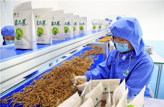 8月18日,工人在盐池县黄花产业融合发展园加工黄花菜。该园区全面投产后,将实现黄花菜一二三产业融合发展,并逐步形成辐射西北地区乃至全国的黄花菜加工、研发、销售中心区域。谷刚 摄