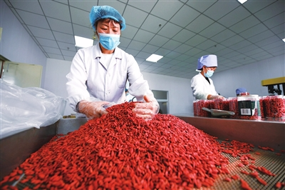 村民在闽宁禾美电商扶贫车间精选枸杞。