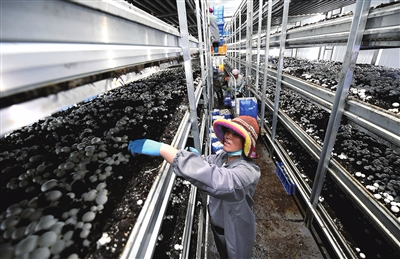 村民在双孢蘑菇工厂化栽培示范基地里工作。