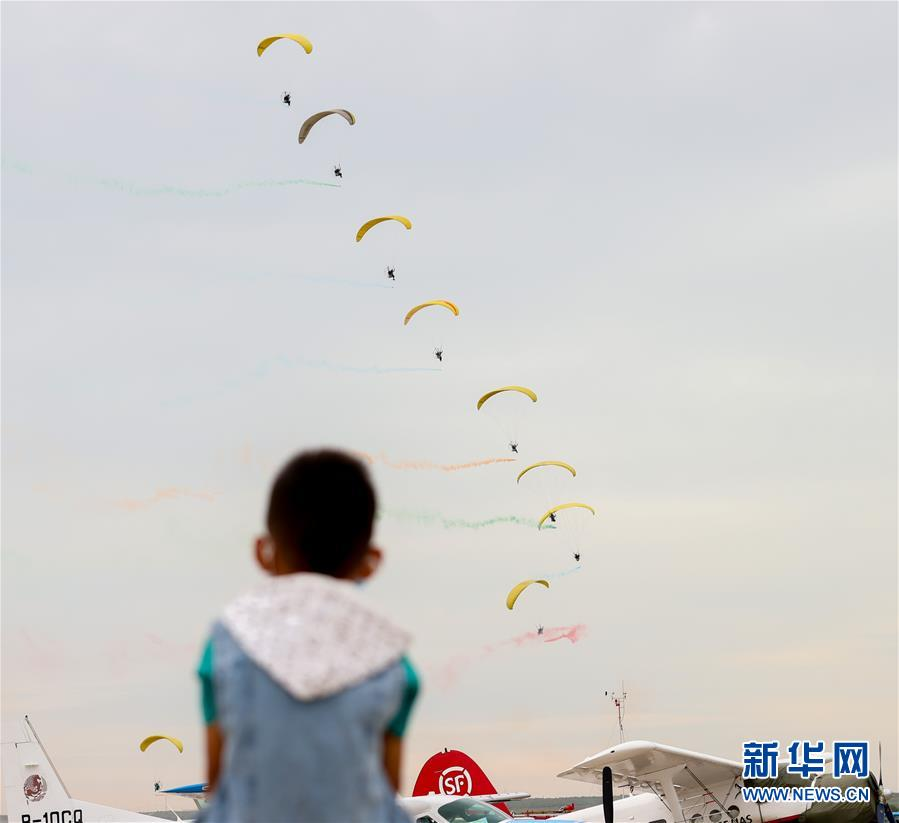 8月14日,表演者在开幕式上进行动力伞飞行表演。