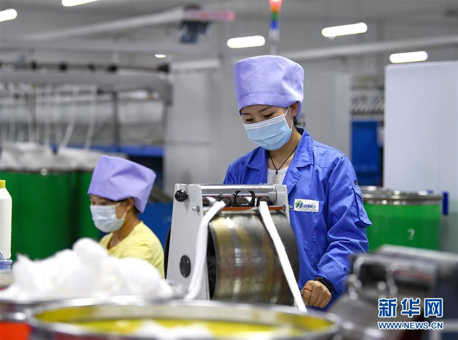 在宁夏吴忠市红寺堡区现代纺织产业园内,工人在生产线上忙碌(6月7日摄)。