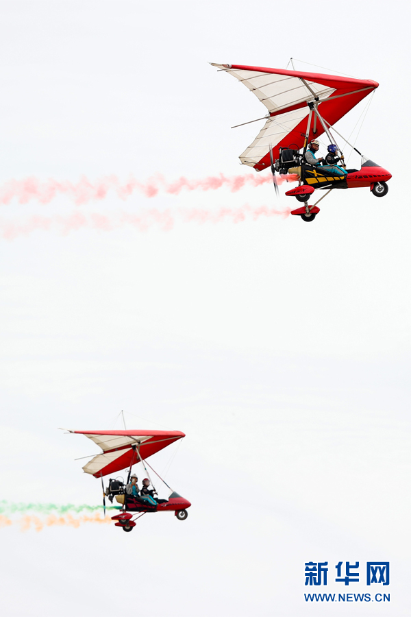 8月14日,表演者在开幕式上进行动力三角翼飞行表演。