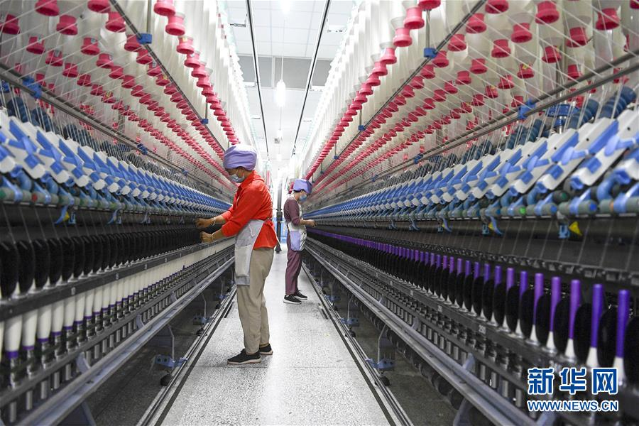 在宁夏吴忠市红寺堡区现代纺织产业园内,工人在生产线上忙碌(6月7日摄)。