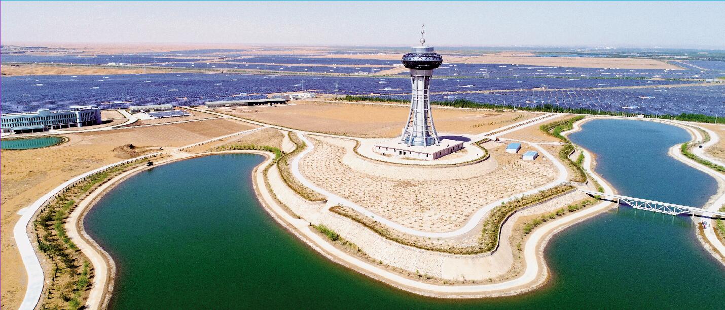 走进中卫市沙漠光伏产业园,眼前的景象让人惊叹:金色的沙漠上,百万块光伏板形成“银色海洋”,不断将阳光转化为电能,光伏板下,连片生长的植被将黄沙紧紧缚住……2012年,为充分利用和发挥中卫市沙漠光热资源优势,大力发展新能源产业,中卫市委、市政府决定在太阳能资源丰富的腾格里沙漠南缘靠近中卫市北部大约6.5万亩沙丘地带,规划建设以光伏发电、新能源装备制造、光伏大棚和农业科技综合利用、生态种植(养殖)、旅游观光为主的沙漠光伏产业园。“先后有20多家企业进驻园区,建成光伏电站容量近1200MWp。光伏产业园不光发电,在治沙方面也发挥着很重要的作用。”中卫市发展改革委工作人员介绍道,一方面基桩能固沙,光伏板能遮阴,为植物生长明显改善环境条件,治沙效果事半功倍;另一方面,绿化治沙能减少风沙侵袭,降低光伏项目的管护成本。