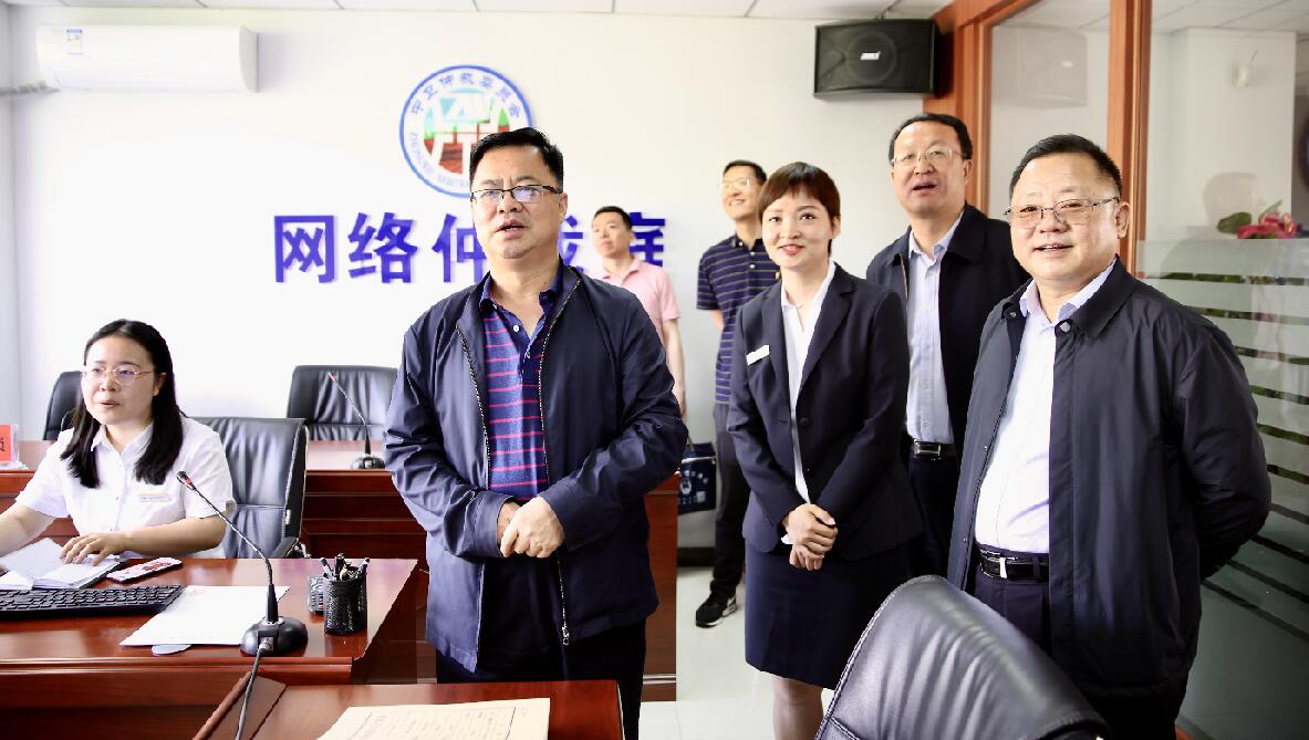 自治区司法厅党委书记、厅长冯自保(左二)在中卫市仲裁委员会听取“人民调解+仲裁+信访”模式的介绍