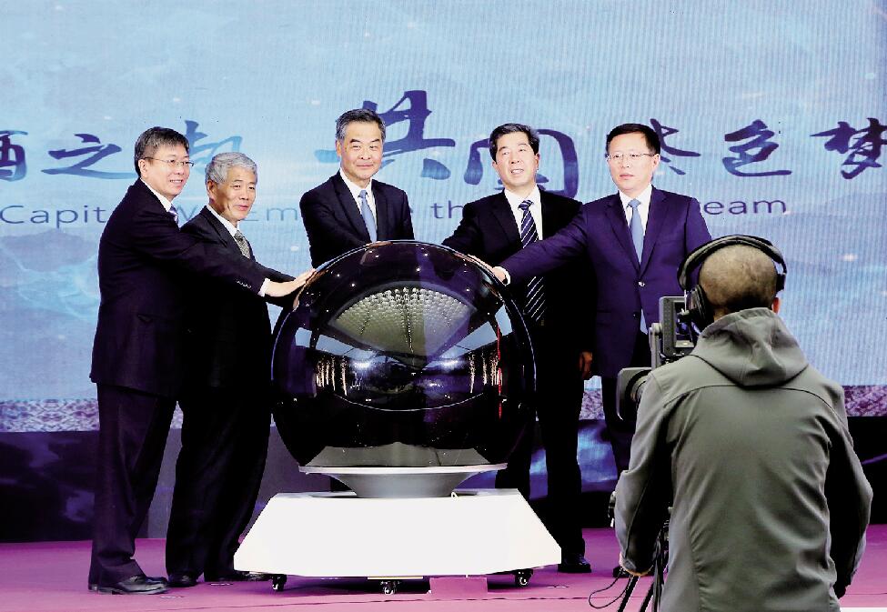梁振英(左三)、陈润儿(左四)、崔波(左二)、中央广播电视总台副台长蒋希伟(右一)和农业农村部总经济师魏百刚(左一)共同为博览会启幕