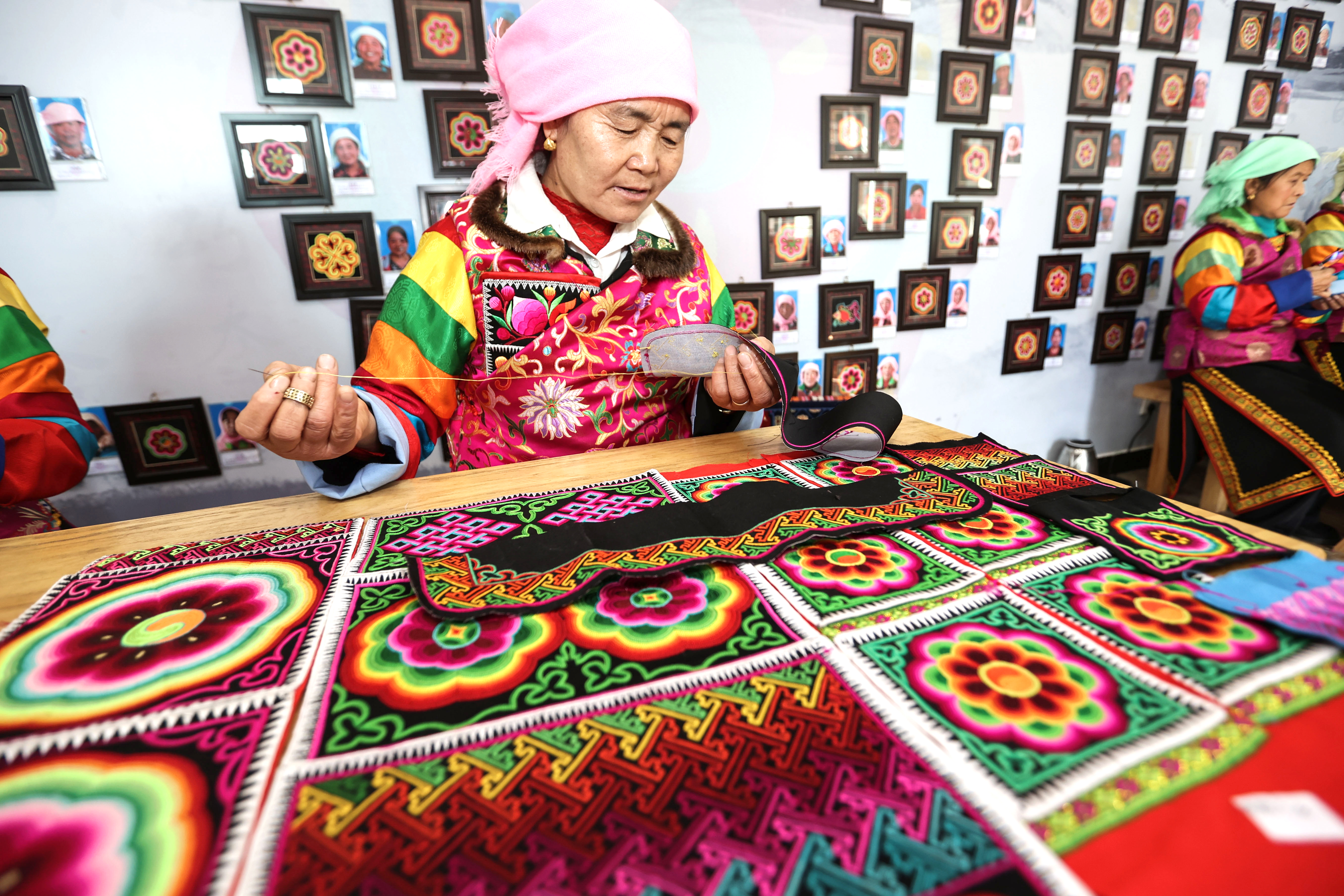 班彦村绣娘在村里的盘绣园内制作盘绣。(新华社记者 吴刚/摄)