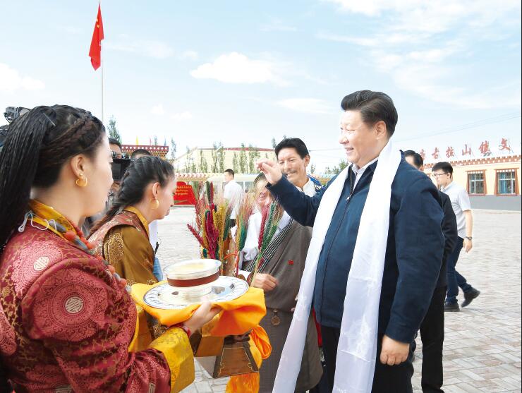 2016年8月22日至24日,中共中央总书记、国家主席、中央军委主席习近平在青海调研考察。这是8月22日下午,习近平在海西蒙古族藏族自治州格尔木市唐古拉山镇长江源村考察时接受村民献上的青稞酒。(新华社记者 庞兴雷 摄)