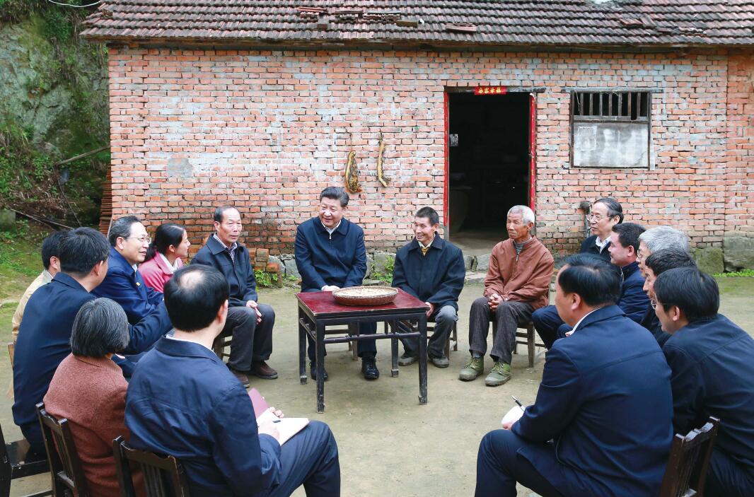 2016年4月24日下午,中共中央总书记、国家主席、中央军委主席习近平在六安市金寨县花石乡大湾村村民陈泽申家同村民亲切交流。 徐国康摄