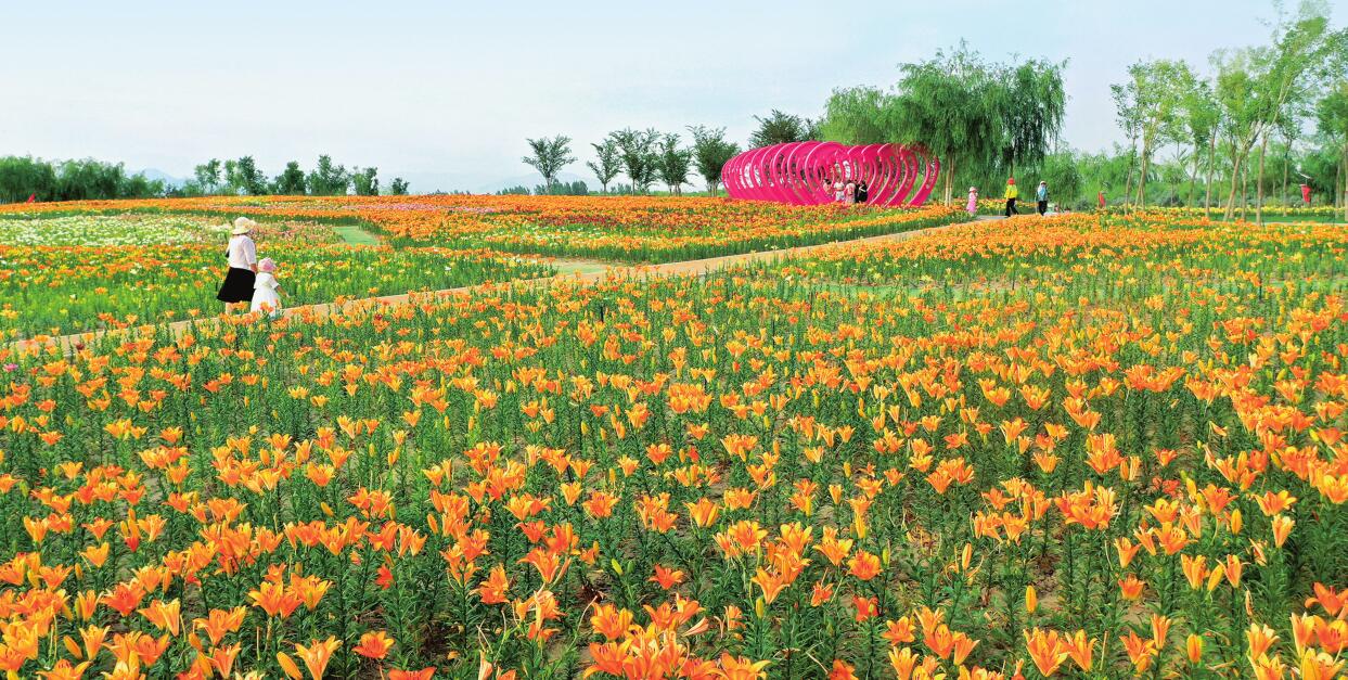 ——艳艳百合为民开。石嘴山市自然资源局的孙志丹带领记者来到大武口区星海镇星海湖畔的网红打卡地。数百亩的百合花五颜六色,竞相开放、格外鲜艳,游人如织、竞相嬉戏,花香随风四溢沁人心脾,使人流连忘返。孙志丹说:“这里曾是一片盐碱地和垃圾场,为改善生态环境给周边6万多名搬迁移民提供休闲地,石嘴山市将这片盐碱地生态修复治理列入了全市重点工程项目。”沙湖星海湖水系连通(星海镇流域段)综合治理工程是集生态修复治理、市民休闲公园、扶贫产业试点与就业、生态旅游等多重功能为一体的综合治理项目,极大地改善了沙湖——星海湖水系连通区域生态环境,也为典农河流域及黄河沿线水域治理发挥了积极作用。