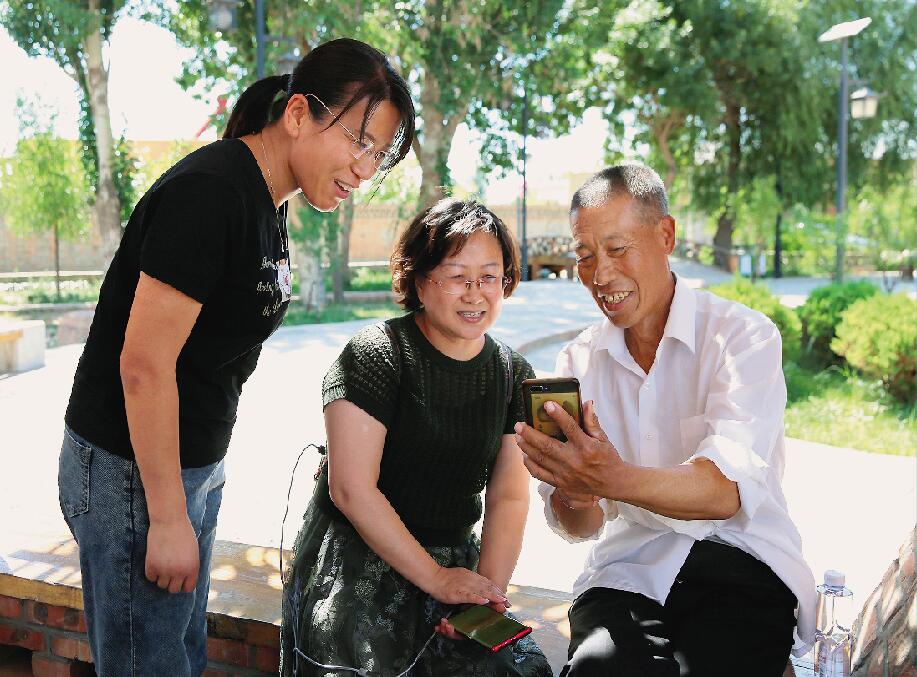 白寺滩村老党员苏虎(右一)给第一书记魏娜娜(左一)和记者分享自己制作的抖音视频
