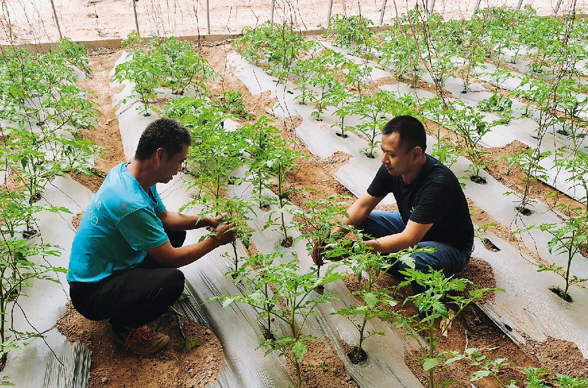 赵忠宏(右)在村民田席平家的大棚里了解西红柿种植及长势情况