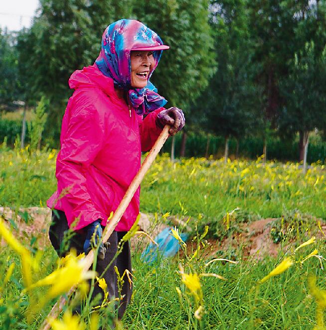 村民在黄花菜基地锄草