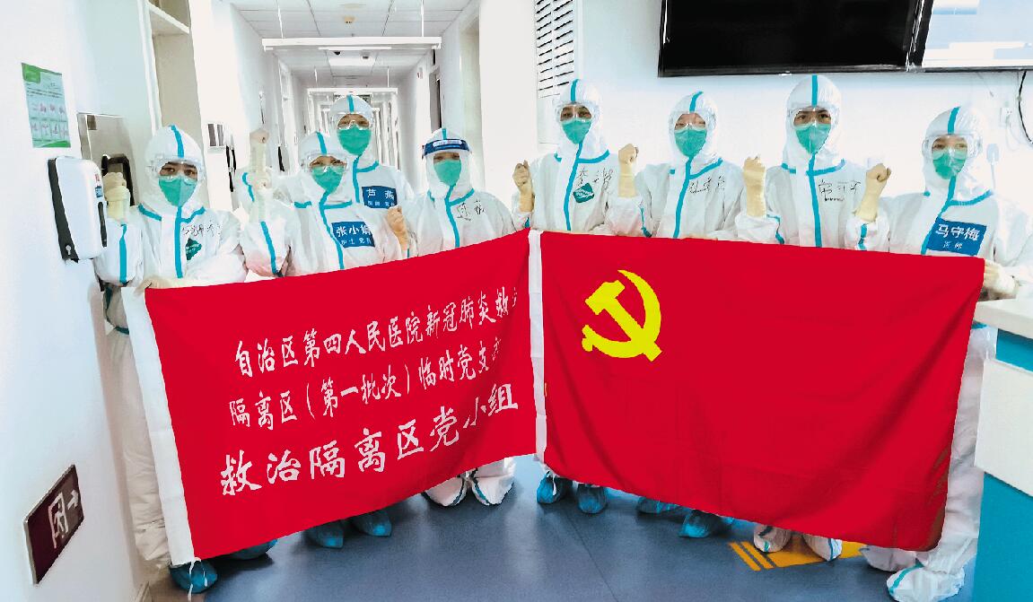 自治区第四人民医院党委下设18个党支部,在疫情集结号“吹响”后,各党支部着眼大局,紧盯党委指挥,发挥支部联动、科室互通的机制,按照任务分工组织党员开展疫情防控工作。随着确诊病例的增加,进入隔离病区的医务人员也在逐渐增加,医院召开专题会议研究隔离病区党建工作,随即成立以专家组成员魏建华同志为党支部书记、刘伯飞同志为副书记的7人隔离病区临时党支部,同时设置专家组、重症组、病区组和医技组4个党小组,确保隔离病区每位党员有组织、有斗志,普通群众有榜样、有依靠,先后有11名同志火线提交入党申请。他们用医者仁心的职业精神真正做到了守土有责,守土担责,守土尽责。