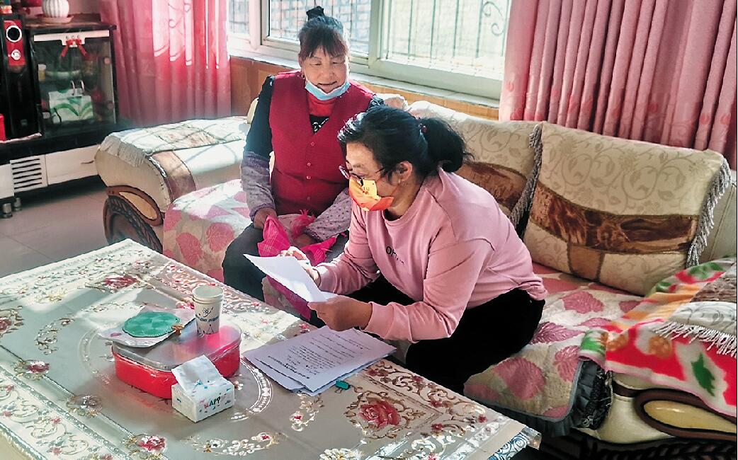 牛香玉(右)入户了解村民生活困难情况,详细讲解救助政策。