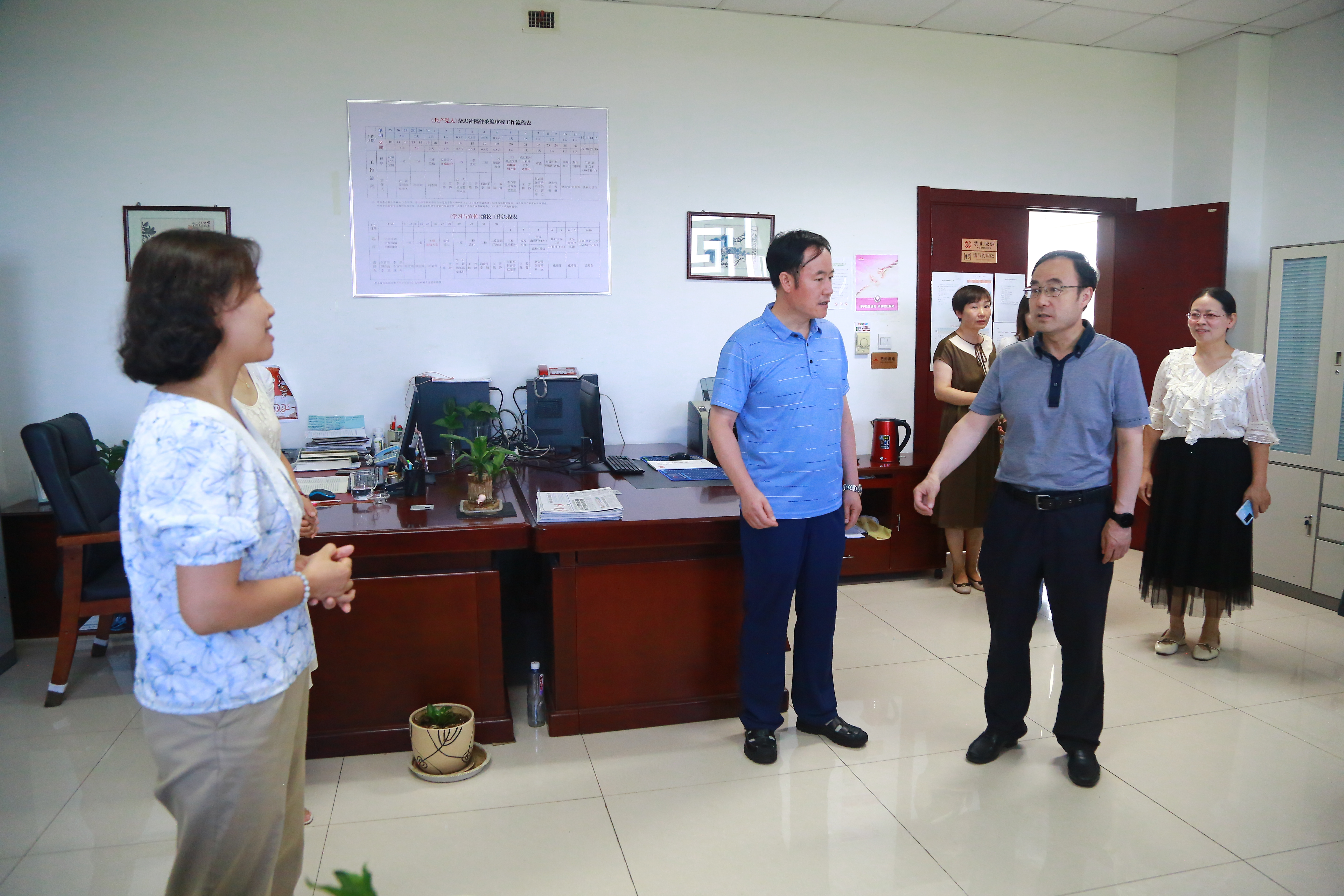 8月16日上午,自治区党委宣传部常务副部长周庆华到共产党人杂志社调研,了解党刊事业发展情况,指导党刊办刊工作。周庆华一行实地走访了刊社总编室、策划部、新媒体部等办公区域,对党刊各部室人员配置及运转情况进行深入了解,与一线编辑、记者亲切交流,并与刊社班子成员座谈交流。