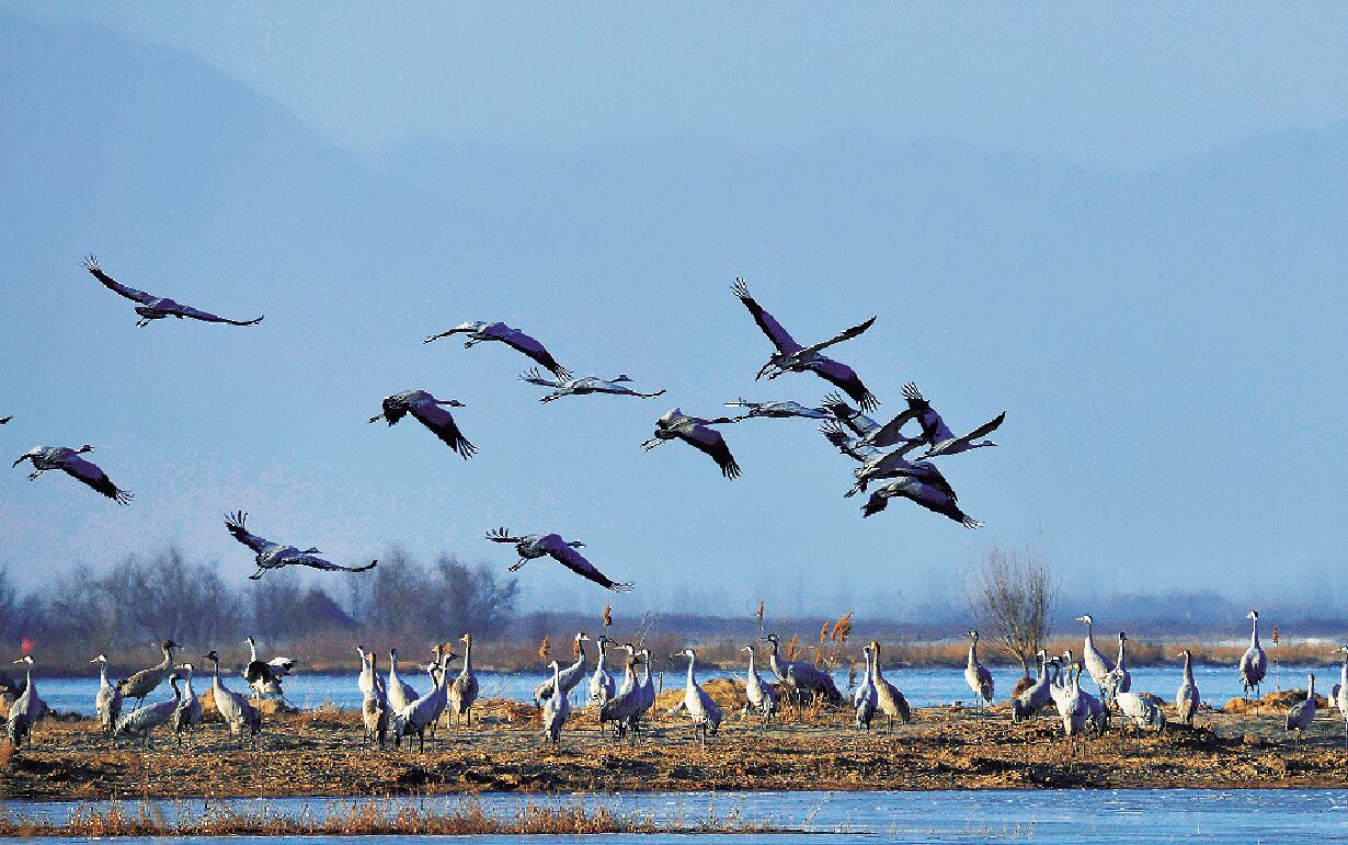 黄河石嘴山段水质和生态环境不断改善,灰鹤家族不断壮大。
