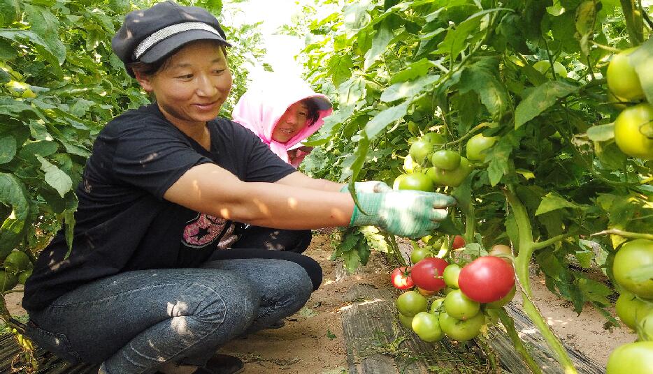 银川市兴庆区月牙湖乡蔬菜种植园区农民正在打理新品西红柿