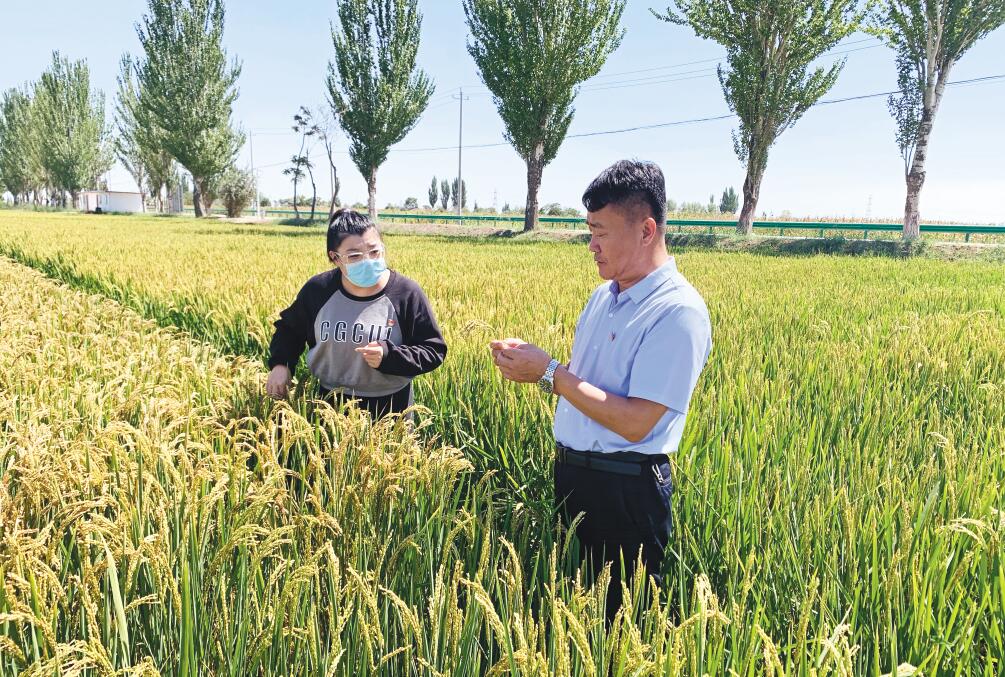 贺兰县立岗镇通伏村党支部书记张志华带着徒弟张婷察看水稻长势