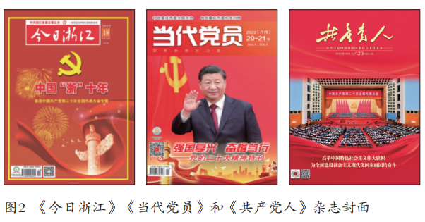 另一种是图文结合的变化型封面,含《今日浙江》《当代党员》和《共产党人》,这类党刊每期封面刊名和版式固定,但以当期报道内容中具有代表性的主题或审美性的图片作为封面(如图2)。《今日浙江》以“中国‘浙’十年”“兴起宣传贯彻党的二十大精神热潮”等主题性的封面呼应党刊关注的时政焦点,凸显党刊的“喉舌”功能;《当代党员》根据当期时政热点特别策划“强国复兴奋楫笃行”“牢记嘱托再出发”等主题,以独家设计的绘制图作为封面,刊名下方固定出现“凝聚思想的力量”,彰显其独具一格的党刊气质;《共产党人》常以具有视觉冲击力和感染力的新闻摄影作品为封面,诉诸宏大叙事,直观的视觉符号建构政治意味浓厚的党建信息场域。