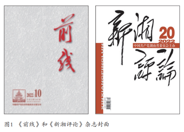 一是外在形象语言彰显红色韵味。党刊的视觉语言是国家和地方政治的晴雨表。而党刊封面是留给读者“第一印象”的关键因素,作为期刊第一语言,党刊的外在形象如何,间接传达着党建议题之于地方党刊的报道风格。研究所涉及的5家党刊,外在形象语言呈现出两种风格:一种是诉诸文字的稳定型封面,包括《前线》和《新湘评论》(如图1),二者均以刊名为主,题字力透纸背,笔锋大气端庄,多采用党和国家领导人的题字,彰显出党的意志与红色思想的韵味,形成一种高档雅致的气场,简洁但不失政治传播的意义空间。