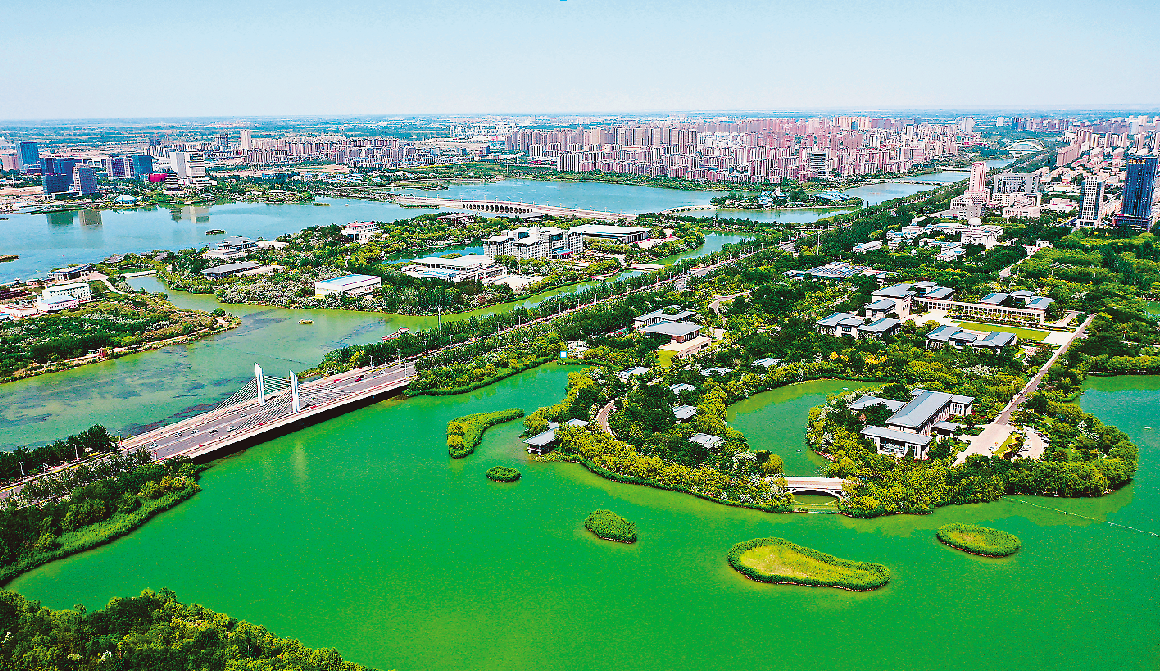 绿树阴浓,夏日正长。宁夏吴忠市滨河大道古城湾砌护段草木葱茏、景色宜人,人们沿着岸边欣赏美景,到“安澜亭”里休憩玩耍。而不远处的古城湾人工湿地,以河卵石、火山岩、砾石等填充物有效去除悬浮物,以各类植物净化吸收有机污染物,最终将净化后的活水输送至黄河或循环再利用。