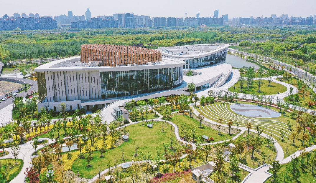从空中俯瞰九棵树未来艺术中心,整体造型宛若一颗萌芽的种子,主体由“三瓣式”的3个建筑单体组合而成。艺术中心有1200座的主剧场、500座的多功能剧场和300座的主题剧场3个室内剧场,以及水岸剧场、森林剧场2个户外剧场。可容纳2000人的户外森林剧场,充分借助了自然地形,观众席被设置在一片被树林环绕的草坡上,如同置身于一个天然氧吧,水岸边嬉戏的互动观演体验区,让观众真正享受大自然的和弦之音。