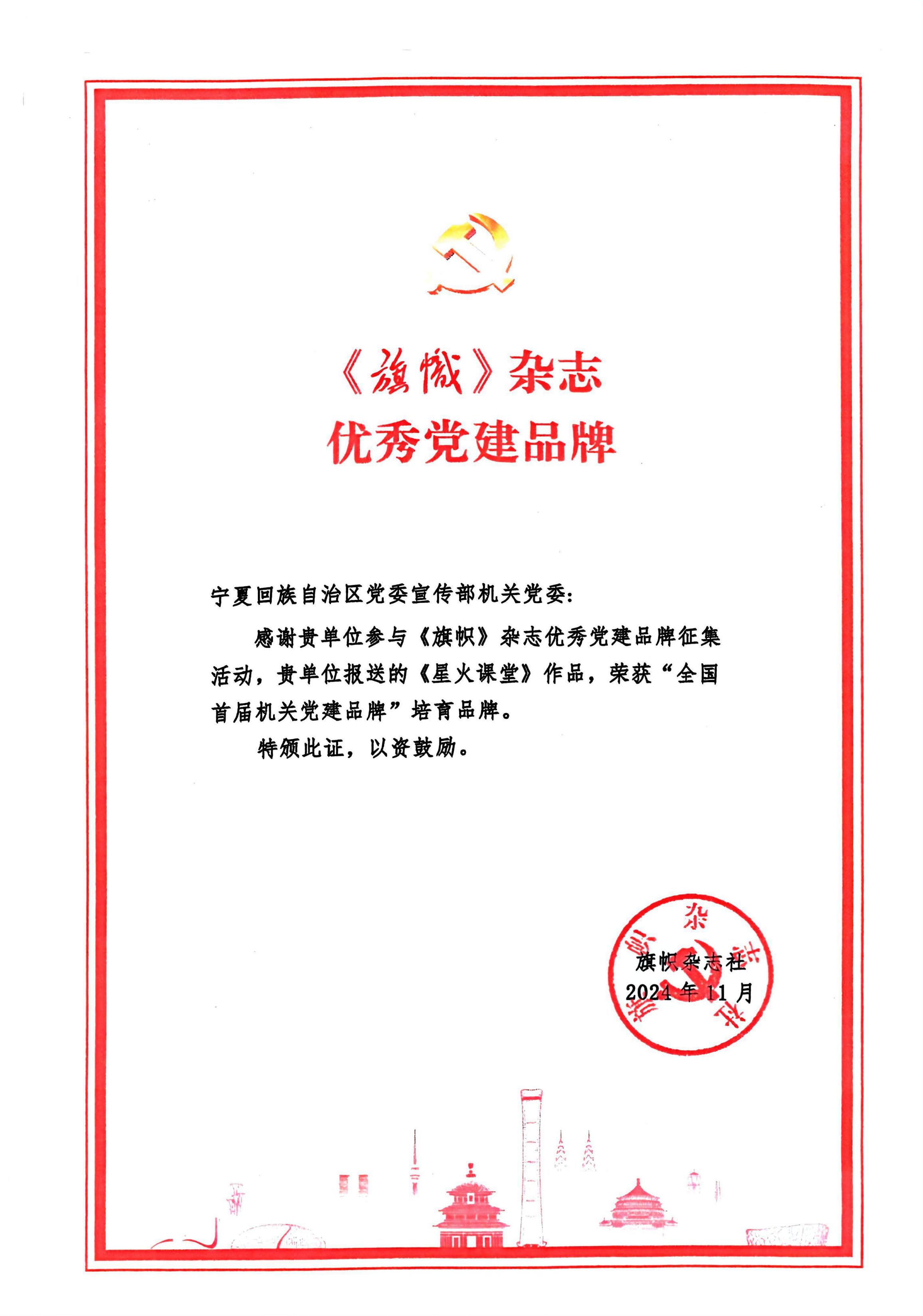 由自治区党委宣传部机关党委推荐的宁夏共产党人杂志社党建品牌“星火课堂”荣获《旗帜》杂志“全国首届机关党建品牌”培育品牌。