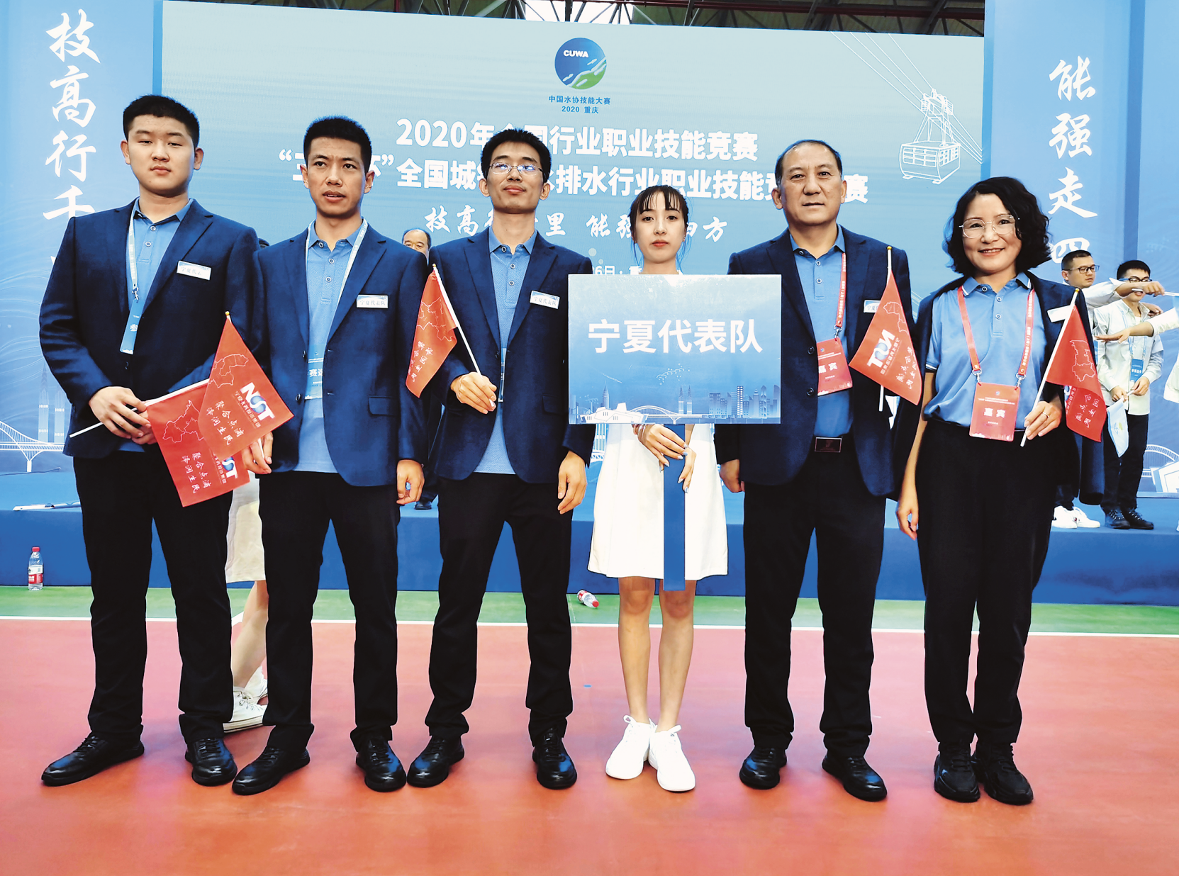 刘荣蓬(左三)在2020年全国行业职业技能竞赛中获得第九名的好成绩。 宁夏水务集团供图