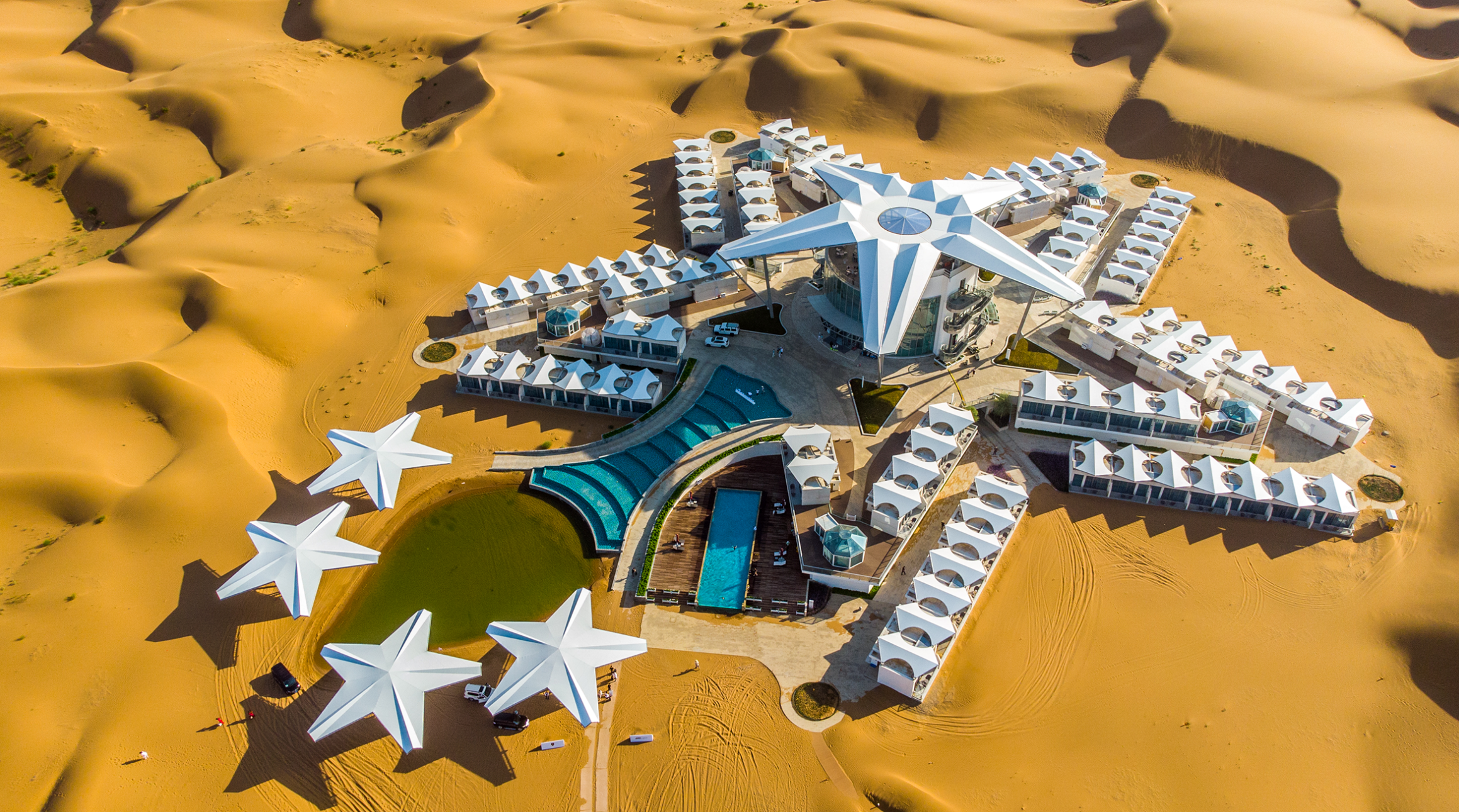 辽阔沙海中,一片片白色帐篷群如散落的帆船,静泊于沙海之中。在中卫市沙坡头景区,1018顶露营帐篷以爱心、圆形等形状错落排布,组成了星火集漫步、么么哒摇摆、显眼包撒欢、星游记探索四大主题营地。在这里,推门见沙海、手可摘星辰,成为越来越多年轻人追寻的“诗与远方”。