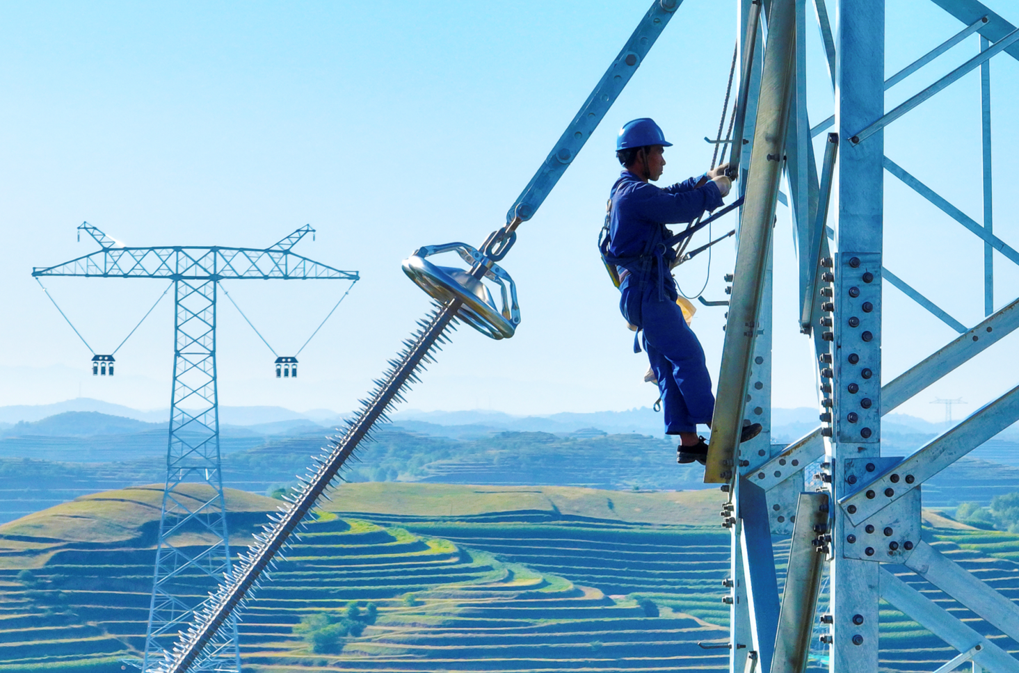 电力工人在西吉县境内的特高压直流组塔现场进行紧固螺栓施工作业。 袁宏彦/摄