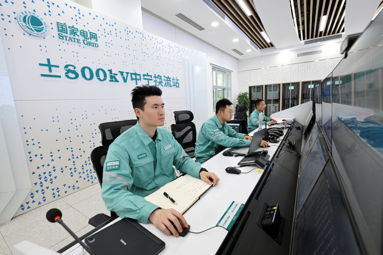 在国家电网有限公司宁夏至湖南±800千伏特高压直流输电工程中宁换流站主控室内,工作人员正密切监控设备的运行状态。 袁宏彦/摄