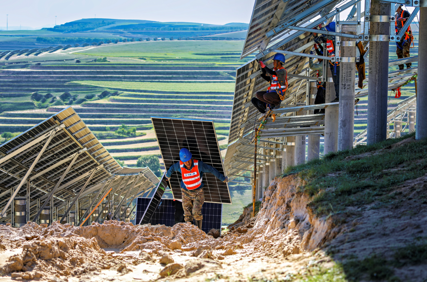 在同心县张家塬乡汪家塬村光伏基地建设现场,工人们正忙着搬运、安装光伏组件。 张旭东/摄