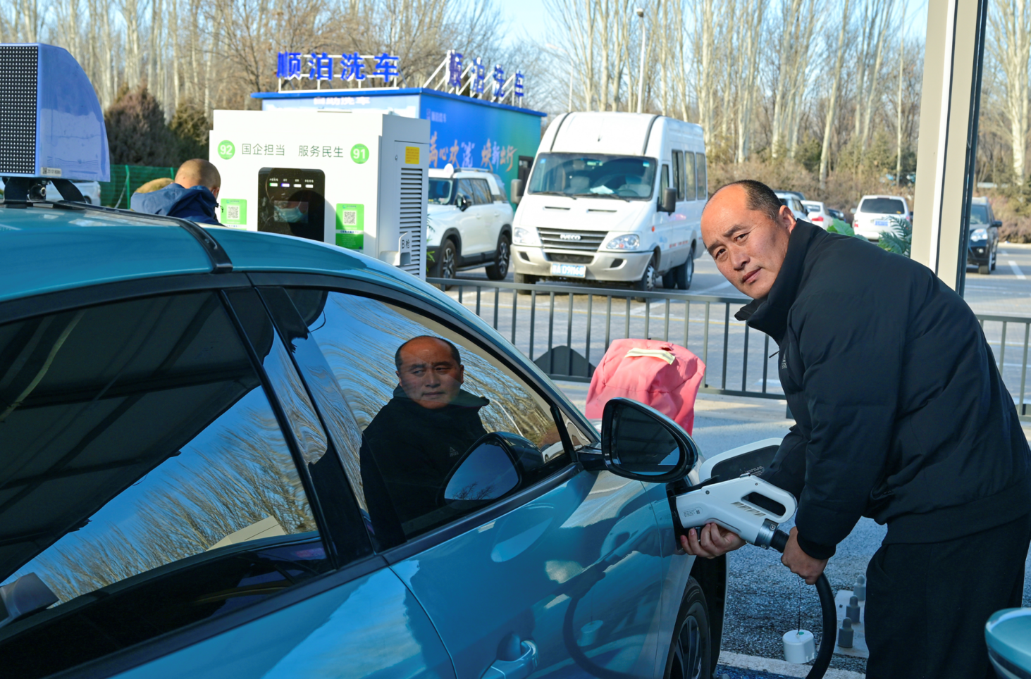 银川市持续推进新能源汽车充电基础设施建设、安全管理与服务提升,逐步构建起覆盖城乡、智能高效的充电服务体系。图为出租车司机在银川国际会展中心光储超充站内为车辆充电。 闫院平/摄