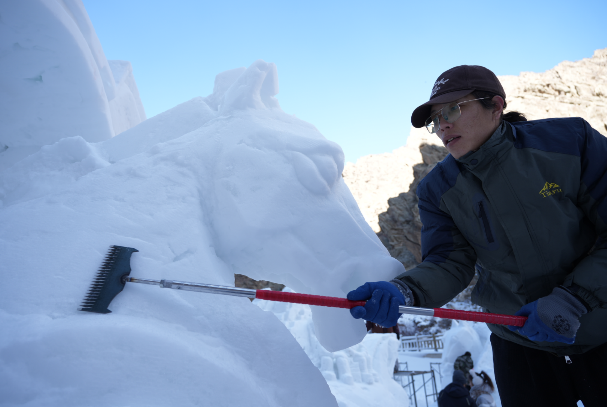 1月10日,贺兰山岩画景区第四届冰峰节在遗址区广场启幕。这场融合冰雪奇观、文化体验与民俗互动的冬日 盛会,为银川冬季文旅市场注入强劲活力。图为高校学生雪雕大赛现场,参赛选手正专注雕琢作品。 马驰/摄