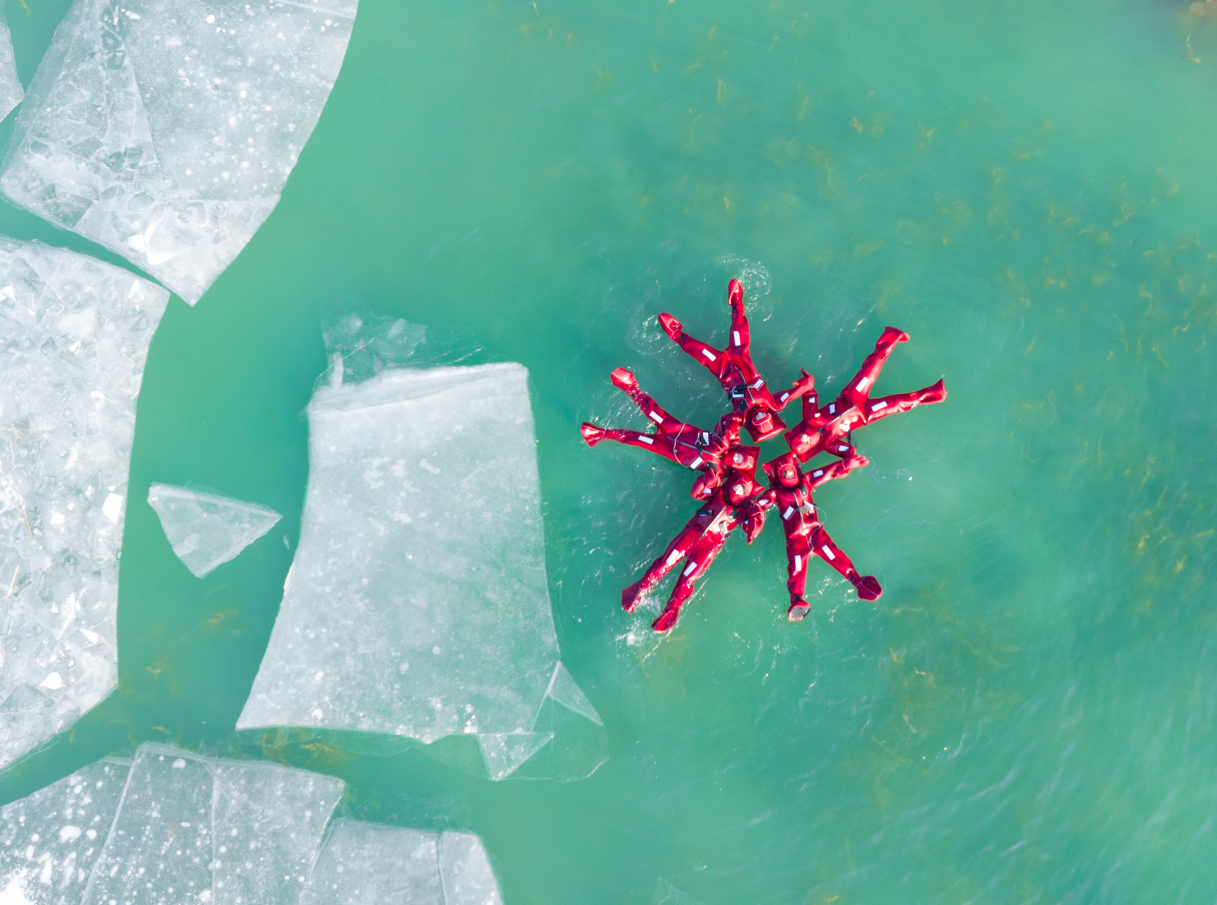 近年来,宁夏因地制宜深耕“冰雪+”经济,涌现出一批新体验、新场景,让“冷资源”真正变成了“热产业”。图为身着特制鲜红漂浮服的游客在银川文旅集团阅海湾景区的湖面上体验冰浮项目。 汪亚飞/摄