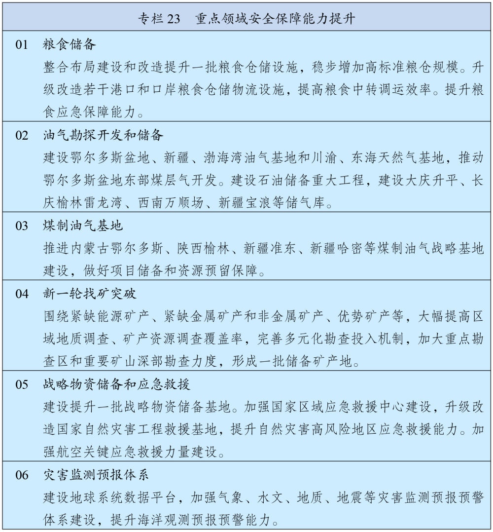坚持立足国内、补齐短板、多元保障、强化储备,加强能源产供储销体系建设。坚持油气核心需求自主保障,实施中长期油气增储上产战略行动,确保原油年产量稳定在2亿吨左右、天然气产量稳步增长,加强煤制油气产能和技术储备。强化政府储备和企业储备协同,提升国家石油储备规模,建立更加灵活的轮换动用机制,增强天然气储备调节保障能力,完善煤炭储备体系。健全能源保供中长期合同制度,完善电力应急调度机制和备用电源配置,强化能源需求侧管理。加强战略性矿产资源勘探开发和储备,深入实施新一轮找矿突破战略行动,统筹加强产品、产能和产地储备,推动大宗商品储运基地建设,提升战略性矿产资源安全风险监测预警和应急保供水平。加强能源资源开发国际合作,维护战略通道安全。