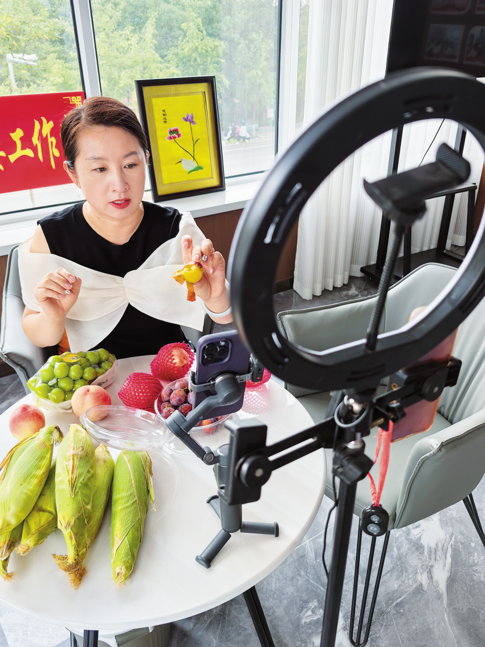 孙清艳在自己开的水果店尝试帮助老百姓直播售卖农产品。 受访者供图