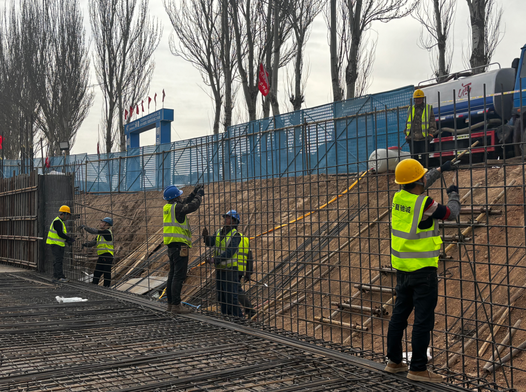 2026年3月17日,青铜峡灌区现代化改造工程惠农渠龙门桥进水闸施工现场,工人正在开展钢筋绑扎作业。 张筱/摄