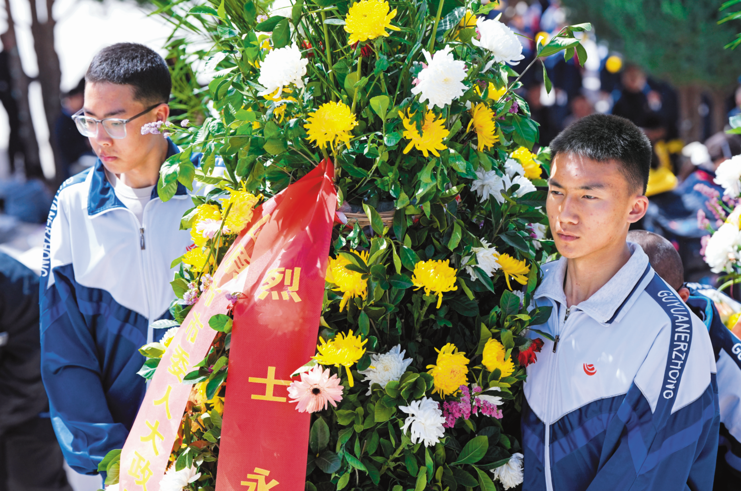 学生代表神情庄重地向革命烈士纪念碑敬献花圈。