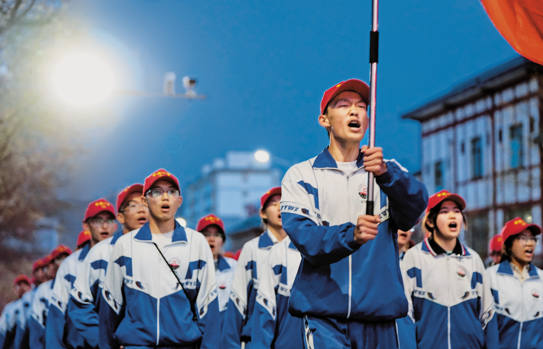 学生们迎着呼啸的山风,排着整齐的队伍坚定前行。