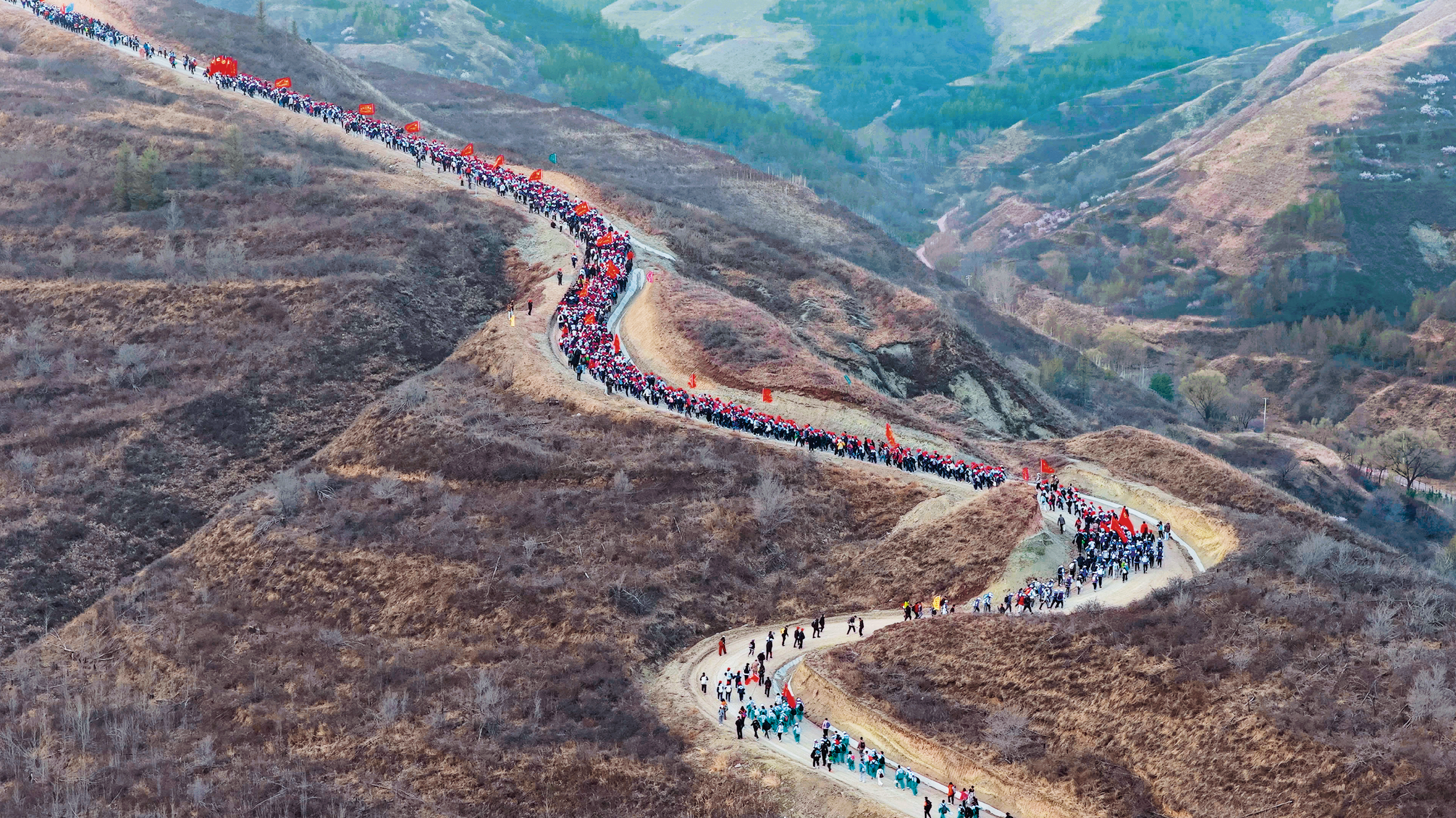红旗猎猎,3000多人的队伍沿山路蜿蜒前行,一眼望不到尽头。