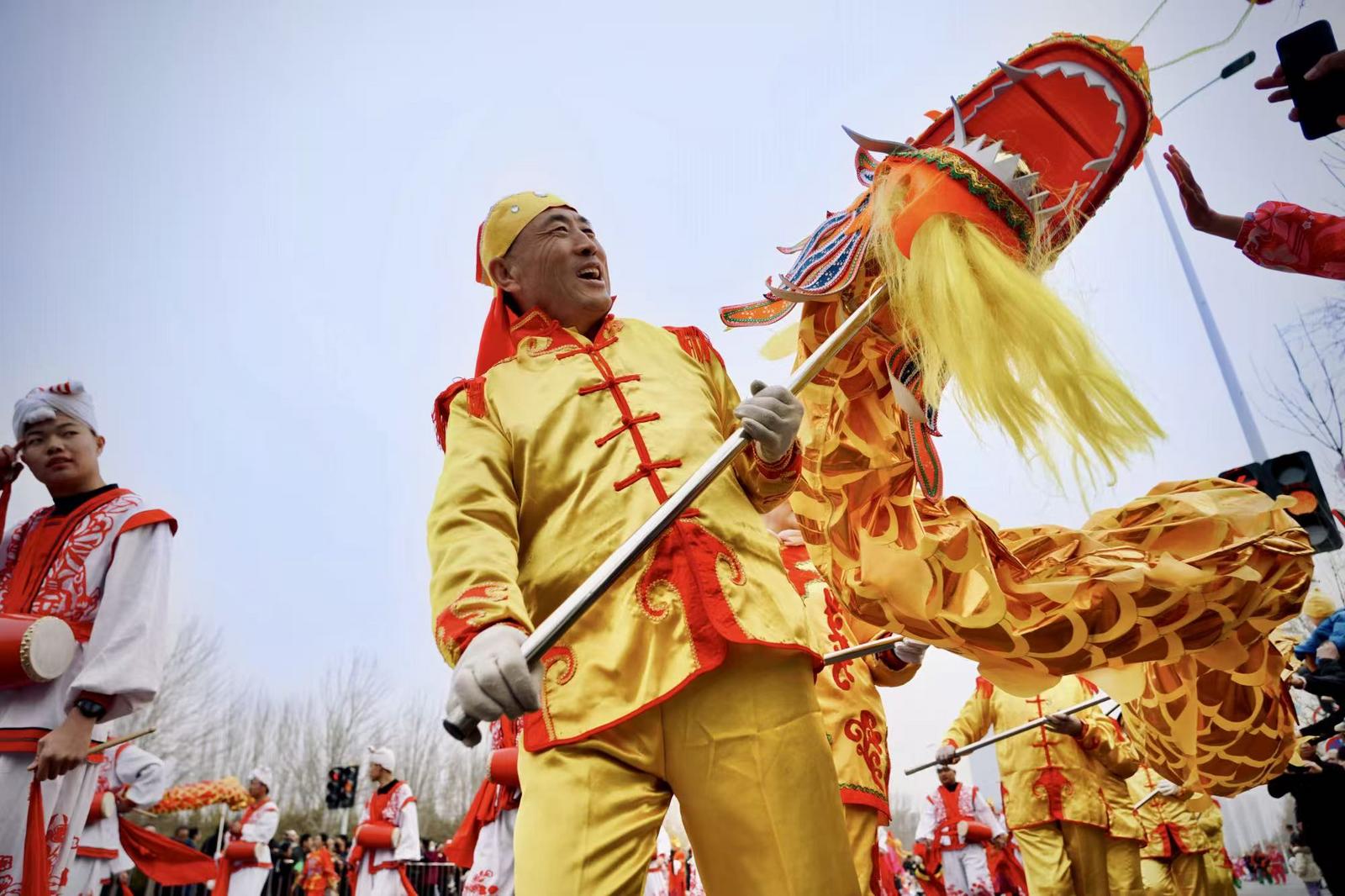 3月1日,在银川览山公园,参赛社火队进行舞龙表演。张文宇/摄