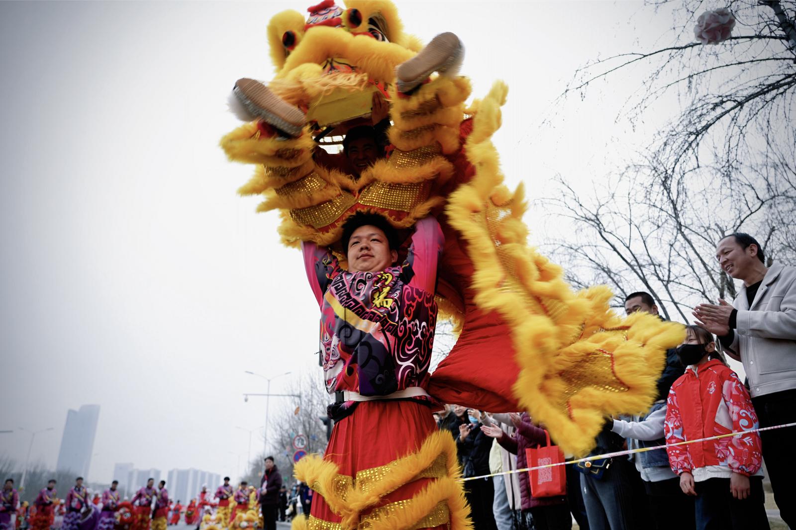 3月1日,在银川览山公园,参赛社火队进行舞狮表演。张文宇/摄